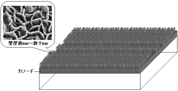 その名の通り壁状に成長したナノカーボンで、その形状が万里の長城や花びらに例えられる。板の厚さは数nmから数十nmで、電圧印加によって先端からエミッションする。容易に想像できるように、CNTエミッタに比べ頑丈で耐熱性も高く、しきい値電界も1V/μm程度と良好だ。成膜方法はプラズマCVD法だが、触媒が不要なのが特徴で、 C2F6やCH4といった反応ガスを変えることによって形状や密度を制御することができる。