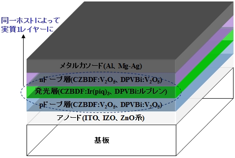 最大のメリットは有機層のレイヤー数を3層、実質的には1層に削減可能なためローコスト化に有利なこと。また、キャリアモビリティの高いホストを用いれば高効率化や低電圧駆動化も容易になる。さらに、デバイスの寿命に影響を与える界面の数が削減できるため、寿命面でも有利と考えられる。 |