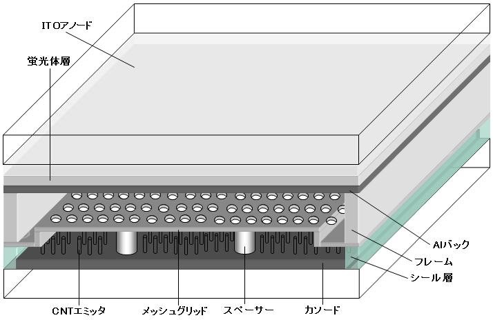 加速電圧を印加して引き出した電子を蛍光体にぶつけて励起して発光させるフィールドエミッション現象を利用した次世代照明デバイス。その最大の特徴は、LEDのような点光源でも、蛍光灯のような線光源でもなく、面光源という点にあり、CNTエミッタなどの優れたフィールドエミッタ特性を生かすことができる。