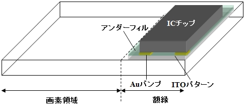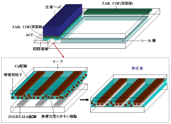 ACFはICの多ピン化や狭ピッチ化にともない従来のワイヤーボンド方式に代わる接続方式で、熱硬化型エポキシ樹脂の中に導電性の粒子を分散させたフィルム。ディスプレイパネルとドライバICを接続する場合、図のようにTAB、COF、COG側の端子とガラス基板上のITOパッドでACFを挟む。この結果、端子間に挟まれた導電性ボールだけが潰れて電気的に接続される仕組み。