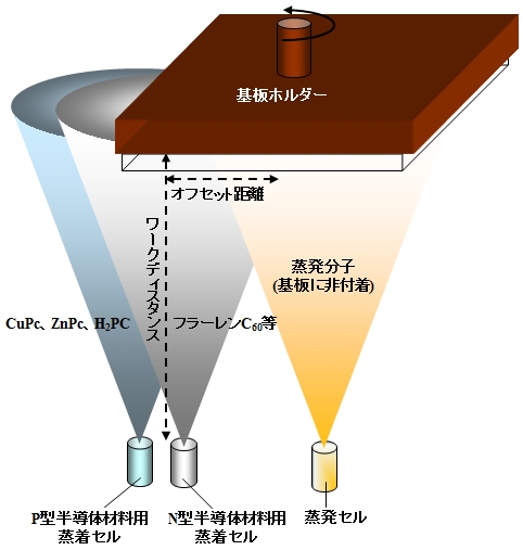 アシスト蒸着法は、基板に付着しない第三の材料を用いて主要蒸着材料の蒸着レートや結晶性を高める方法。有機薄膜太陽電池の有機半導体膜蒸着工程では共蒸発分子誘起結晶化法と呼ばれ、n型とp型有機半導体を共蒸着しながら、基板に付着しない共蒸発分子としてポリジメチルシロキサン(PDMS)などの液体分子を同時蒸発させて有機半導体分子に衝突させすることにより有機半導体の結晶化を誘起する。つまり、有機半導体の結晶性を高める狙いがあり、とくに光電流の生成が大幅に向上するといわれる。この方法は共蒸着膜だけでなく、p層、n層の単層蒸着膜でも有効で、グレインサイズが増加するとされる。 |