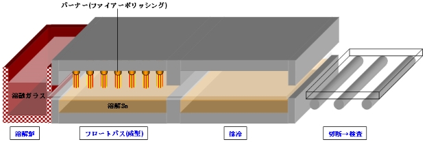 フロートバスと徐冷室はそれぞれ50m以上もあり、ゆっくりと徐冷できるため寸法安定性に優れる。出口側でガラスを引く速度を速めることで薄型化でき、逆にせき止めるように制御して厚みをつける。