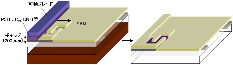 フロー・コーティング法は、基板の上部に可動型塗布ブレードをわずか上方に傾けてセットし基板と200μm程度のギャップを確保。その空隙に溶液を注入した後、塗布ブレードを平行移動させることによって膜を配向させながら塗布する仕組み。低沸点溶液が塗布できるほか、スピンコート法に比べ材料利用率が高く、少量の試料で実験ができる。とくに有効なのは塗布型有機半導体層で、有機半導体分子は配向成長するため、チャネル長方向に対して平行に掃引するとモビリティが向上するといわれる。 |