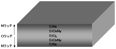 その名の通り、断面組成がグラデーション(傾斜)になっている膜。例えば、図のようにデバイスのSi系ガスバリア膜を成膜する場合、同じで主原料(ターゲット材またはCVD原料)を使いながら、ガス雰囲気やガス分圧を時間によって変化させることによりNリッチやOリッチといった傾斜組成膜を連続成膜する。