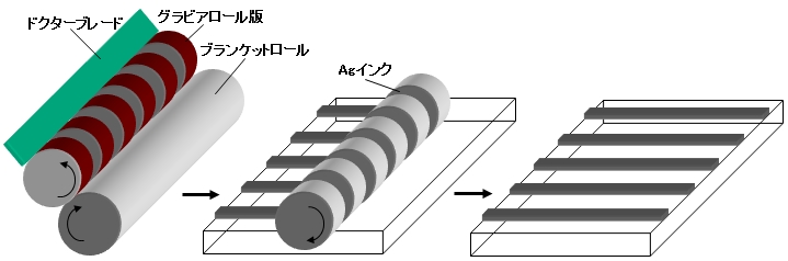 グラビア印刷やグラビアオフセット印刷で用いる円筒状の版。彫刻のように、シリンダーの表面に溝パターンが刻まれており、まずここにインクを充填した後、ワークにインクを再転写して印刷する。この際、ワークに直接転写印刷する方式をダイレクトグラビア印刷(または単にグラビア印刷)、シリコンブランケットロールに転写した後、再びワークに転写する方式をグラビアオフセット印刷という。スクリーン印刷法に比べ高速で印刷できるほか、印刷解像度も比較的高く10μmクラスのファインパターンが印刷できる。その反面、設備が大掛かりになるほか、高精度グラビア版が供給できるメーカーが少ないことがデメリットといえる。