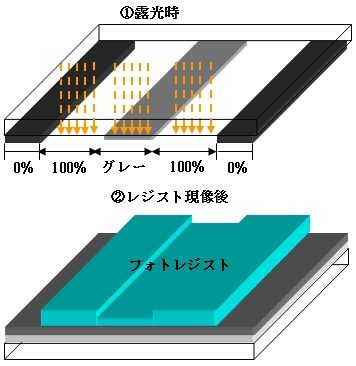 ところで、フォトマスクを用いてファインパターンを作製する場合、パターニング精度は描画装置の解像度>フォトマスクの解像度>デバイスパターンの解像度と、プロセスフローが進むにつれて精度が劣化する。このため、解像性・精度・寸法安定性はフォトマスク基板の種類と描画装置の解像度によって決まると考えていい。