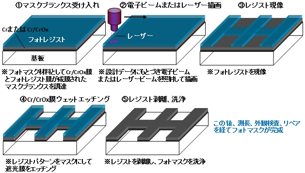 フォトマスク(半導体向けはレチクルと呼ばれる)はクロムマスクの場合、@スパッタリング法でCr膜またはCr/CrOx膜を成膜、Aポジ型フォトレジスト塗布・硬化、B電子ビーム描画またはレーザー描画、Cフォトレジスト膜現像、D遮光膜ウェットエッチング、Eフォトレジスト膜剥離といったフローで作製される。デバイスの製造と異なるのは基本的に露光工程または描画工程で、フォトマスク製造フローではCAD(Computer Aided Design)データを元に電子ビームまたはレーザービームを一筆書きのメカニズムで照射してレジスト膜をパターニングする。当然、フォトマスク生産ラインでもっとも高価な装置が描画装置であり、億円単位での投資が必要になる。なお、PCBはフォトマスクと同様、露光工程を描画工程に置き換えたレーザー直接描画で製造されるケースもある。一方、エマルジョンマスクの場合、@ハロゲン化Ag含有ゼラチン膜塗布、Aレーザー描画、B現像といったフローで作製される。