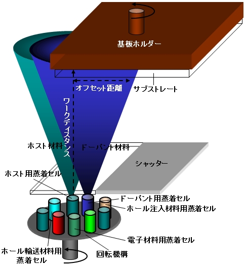 また、有機ELデバイスではキャリアトランスポートレイヤー〜発光層にも有効で、この場合、おもにホストマテリアルと複数のゲストマテリアルの蒸着比率をコントロールすることにより、ホストベースのグラデーションレイヤー(界面レス化ともいう)を成膜する。つまり、従来機能分離していた3層(例えばホール輸送層/発光層/電子輸送層)を実質的に1レイヤーにする。 |