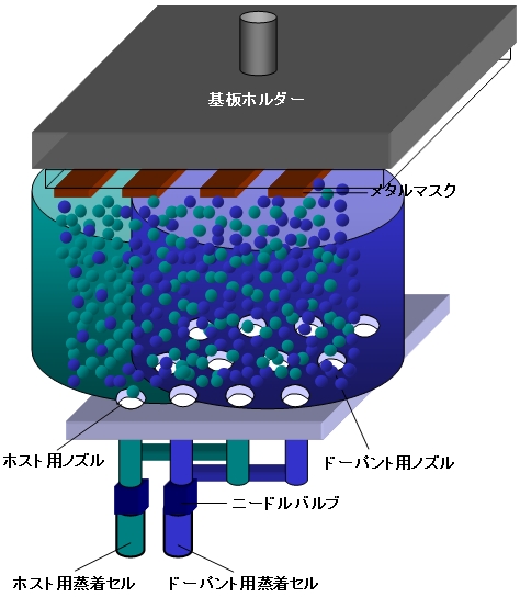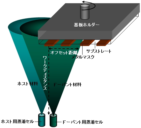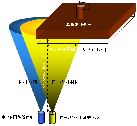 二つ以上の材料をそれぞれの蒸着源から蒸着させて基板上で混合膜を蒸着する成膜法。有機ELデバイスや有機薄膜太陽電池などの活性層を成膜する際に用いられ、図のようにホストと微量のドーパントを共蒸着する。 |