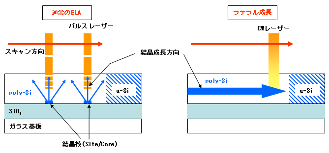 ラテラル成長法(Lateral Crystallization)は文字どおり横方向に結晶を成長させる手法で、低温poly-Si TFT製造プロセスにおいてa-Siプリカーサ膜を結晶化する際に用いられる。コンベンショナルなエキシマレーザーアニール(ELA)の場合、図のように熱の吸収が表面から始まり、表面から下に向けて溶け出し、下側から冷却が始まって下から上に向かって凝固していく。このため、横方向に成長する時間がなく、グレインサイズは膜厚に律則される。パルスレーザーの冷却スピードは10億℃/秒と、非常に速いため横方向に成長する時間はほとんどない。急激な冷却は結晶の核をあちこちに発生させてしまうため、結果として大きな粒径が得られない。