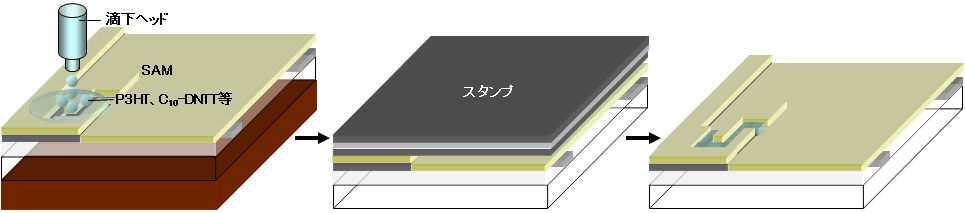 | ▲マイクロコンタクトプリント法による有機半導体層形成イメージ |