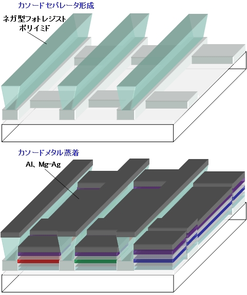 パッシブマトリクス駆動有機ELディスプレイや調色/調光型フルカラー有機EL照明パネルのカソードをパターニングする手法。図のようにフォトレジストやポリイミドをストライプ形状でパターニングした後、Alなどのメタルをベタ蒸着する。この結果、メタル膜が上下でセルフパターニングされる仕組み。カソードラインのショートを回避するため、図のようにフォトリソで逆テーパー状でパターニングするのが一般的だ。