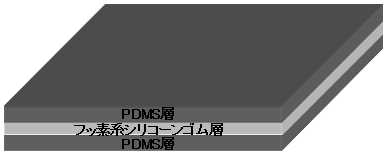 図のように表面層にPDMS層(両面)、中間層に溶剤浸透を遮断するフッ素系シリコーンゴム層からなる3層構造スタンプを使用。このスタンプは表面平滑性が高く、溶剤吸収にともなう歪みが小さい。このため、溶剤を数分かけてゆっくり吸収し、しかも表面付近に保持する。すなわち、スタンプ表面の“半濡れ”状態が持続するため、スタンプ-薄膜間の固着力は基板-薄膜間の固着力に比べ常に弱く、薄膜を基板表面に残したままスタンプがリリースされる。剥離後はスタンプから溶剤が徐々に脱離するため、スタンプを繰り返し使用することができる。