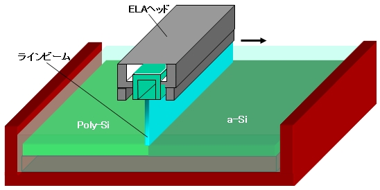 低温poly-Si TFT-LCDでa-Siプリカーサ膜を結晶化する際に標準的に用いられる。XeCl(波長308nm)またはKrF(248nm)の高パワーエキシマレーザー(出力300Wクラス)を照射することでa-Siを溶融再結晶化してpoly-Si膜にする。現時点ではラインビームによるスキャン方式が一般的である。