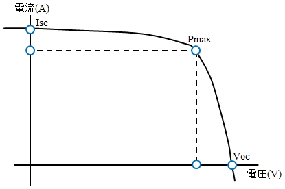 図は太陽電池のI-V曲線を示したもので、電圧0V時の電流を短絡電流(short-circuit current=Isc)、電流が流れていない時の電圧を開放電圧(open-circuit voltage=Voc)と呼ぶ。太陽電池から最大の電力を取り出すには、電圧と電流の積が最大になる点である最大出力(Pmax)で動作させる必要がある。光電変換効率は、この最大出力を入射光強度で割った値である。