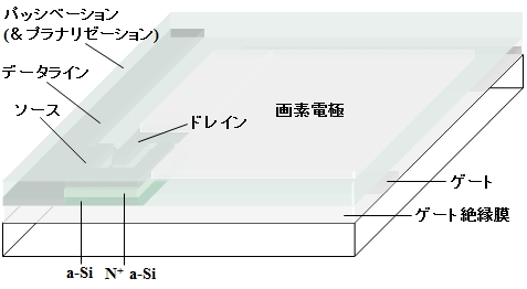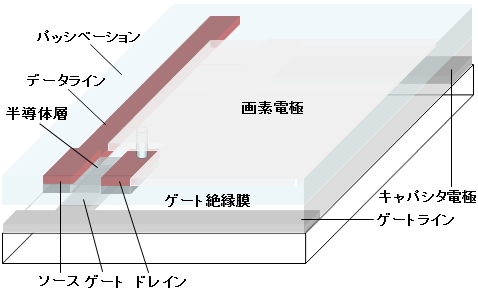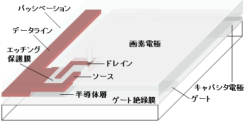 a-Si TFTが量産化された当時はエッチングストッパー型が主流だったが、コストダウンのため、今日ではすべてバックチャネル型となっている。一方、IGZO-TFTをはじめとする酸化物TFTでは酸化物半導体層がよりセンシティブのため、いまだエッチングストッパー型が主流になっているようだ。