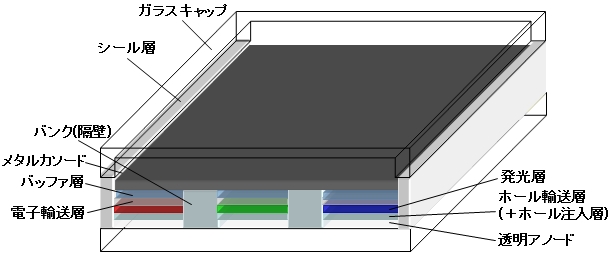 もちろん、コンベンショナルなRGB3色独立発光方式から、単色発光+カラーフィルター方式までカラー化方法も自在で、効率が低い色は他の色よりも発光ユニット数を増やしてRGB3色のバランスをとることもできる。また、発光材料も一般的な蛍光材料だけでなく、燐光材料を用いることも可能だ。 |