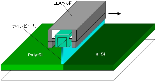 低温poly-Si TFT-LCDでa-Siプリカーサ膜を結晶化する際に標準的に用いられる。XeCl(波長308nm)またはKrF(248nm)の高パワーエキシマレーザー(出力300Wクラス)を照射することでa-Siを溶融再結晶化してpoly-Si膜にする。現時点ではラインビームによるスキャン方式が一般的である。