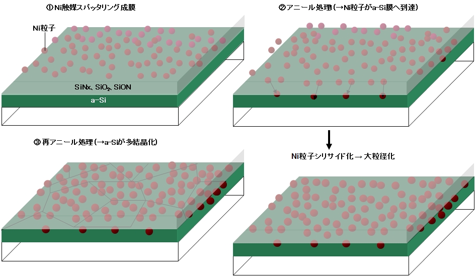 アニール工程は結晶性を左右するキープロセスであり、結晶性が上がればモビリティも向上する。グレインサイズを大きくすることで、結晶粒界の欠陥を相対的に低減させるアプローチが一般的だ。レーザーアニールはa-Si膜を一旦溶かしてから再結晶させるが、冷却時に膜の体積が増えるため、結晶と結晶の間で隆起が発生し、これが欠陥となりVthのバラつきを引き起こすと考えられている。近年ではこの冷却速度を緩和するために、レーザーをパルスレーザーからCWレーザー(連続波)に変える試みもある。