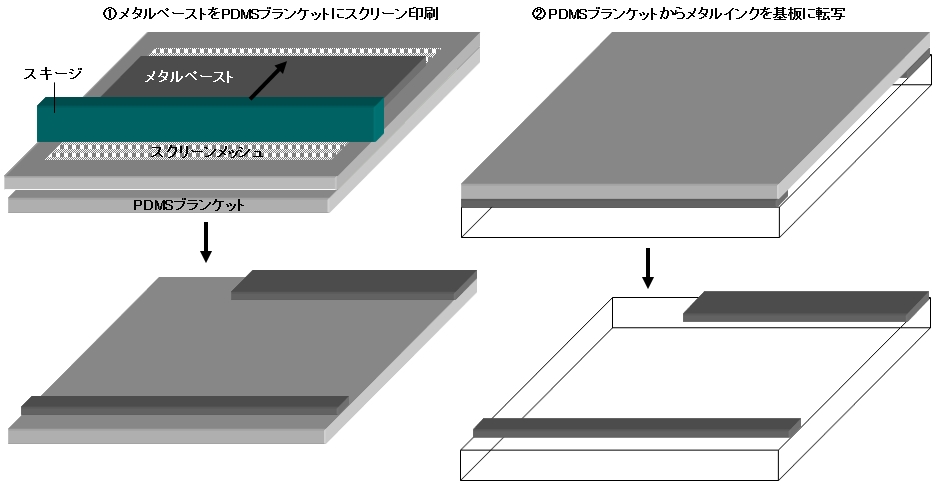 コンベンショナルなスクリーン印刷法を改良したメソッド。いうまでもなく、通常のスクリーン印刷は基板上に直接ペーストを印刷するのに対し、オフセットスクリーン印刷ではPDMS(ジメチルポリシロキサン)ブランケット上にペーストを印刷した後、このPDMSブランケットを基板に接触させて転写する。この際、PDMSブランケットがペーストに含まれる溶剤を吸収するため、基板への転写時にペーストのにじみが少なくなり、印刷解像度が向上する。さらに、PDMSブランケットの存在によって基板上にスクリーンマスクのメッシュ痕もほとんど残らない。もちろん、厚膜化が容易というスクリーン印刷の特徴は兼ね備える。