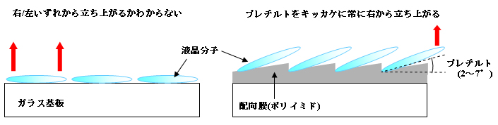 図の左のようにプレチルトがない場合、液晶分子の立ち上がりは右からと左からの二通りに分かれる。すると傾きが互いに逆になるリバースチルトが存在することになり、コントラストが低下するなど光学特性に不都合が生じてしまう。プレチルトはこの問題を防ぐ役割を果たす。