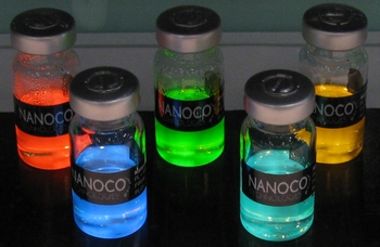 QDは、一般的にコアとシェル(殻)によって構成されるコア-シェル型材料を用いる。これは、コアオンリー材料に比べ発光強度が向上するため。ポピュラーなのはコアをCdベース、シェルにZnS系にしたCd-ZnS系で、発光色はコアサイズとシェルの組成成分によって設定する。例えば赤色と緑色はコアサイズ6〜8nmで、赤色はCdSeコア+CdZnSシェル、CdSeコア+CdS/ZnSシェル、波長520〜580nmの黄緑色材料はCdZnSeコア+CdZnSシェルを用いることが多い。一方、コアをZnリッチにするとバンドギャップが広がり、青色発光が得られる。青色QDの粒径は約10nmで、CdZnSコア+ZnSシェルが知られる。つまり、前記のように色調整がきわめて容易といえる。