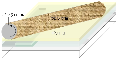 LCDのポリイミド配向膜を一定方向に配向させる方法で、この結果、液晶分子が配向する。液晶分子を配向させたい方向に向かって、配向膜の表面を機械的に擦る手法で、ドラムにベルベットのような1〜2mmの毛足を持った布を巻きつけ、回転させながら基板上を通過させる。布の巻き方、擦る際の毛あたりの強さが表示品質に影響を与えるとともに、布の均一性やラビングローラの偏芯、振動、基板ステージの平行度、剛性などでラビングの不均一性を生じ、表示ムラを引き起こすことがある。 |