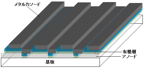 パッシブマトリクス駆動有機ELディスプレイや調色/調光型フルカラー有機EL照明パネルのカソードをパターニングする手法。図のようにフォトレジストやポリイミドをストライプ形状でパターニングした後、Alなどのメタルをベタ蒸着する。この結果、メタル膜が上下でセルフパターニングされる仕組み。カソードラインのショートを回避するため、図のようにフォトリソで逆テーパー状でパターニングするのが一般的だ。