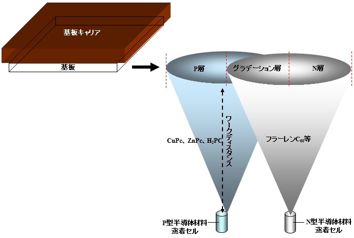 i層は膜厚方向にしたがってグラデーション組成にするため、p型、n型の蒸着源を配置して共蒸着しそれぞれの蒸着レートを随時コントロールするか、またはインライン蒸着装置によりp層、i層、n層を連続蒸着する。 |