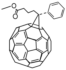 [6,6]-Phenyl-C61-Butyric Acid Methyl Ester(フェニルC61酪酸メチルエステル)の略称。フラーレン誘導体で、フラーレンと違い、クロロベンゼン、クロロホルム、トルエンなどの有機溶媒に可溶なため、塗布型有機薄膜太陽電池のn型有機半導体としてよく用いられる。 |