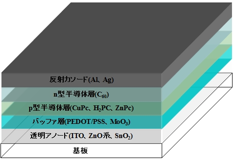 色素増感太陽電池と並ぶ代表的な有機太陽電池。基本構造はアノード〜p型/n型有機半導体層〜カソードとシンプルで、有機ELと逆のメカニズム、つまり光吸収によって半導体層から電子とホールが発生し、両電極に移動して発電する仕組み。このため、有機EL技術を流用して作製されるのが一般的である。