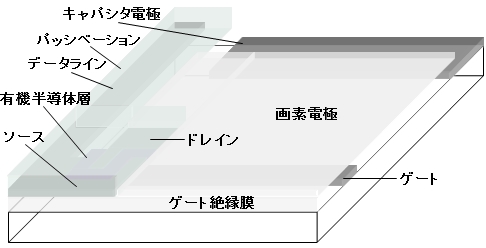 電界効果トランジスタはゲート電極に電圧を印加してチャネルの電界により電子またはホールの流れに関門(ゲート)を設けるもので、これによりソース〜ドレイン間の電流を制御する。有機トランジスタもFET原理に基づいているため、FETと称されることもある。