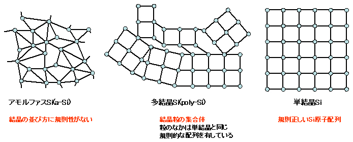 Si膜をはじめ半導体膜はその結晶性がデバイス特性に大きな影響を及ぼす。例えばa-Siは図のように不規則に配列しており、電子・ホールのポテンシャルエネルギーも不規則に分布している。キャリアはこの不規則なポテンシャル中を進まなければならないため、キャリアモビリティは遅くる。これに対し、poly-Siは結晶粒のなかでは単結晶と同じ立方晶状であるため、キャリアは規則的な周期ポテンシャルのなかを自由に動き回ることができ、結果的にモビリティが向上する。 |
