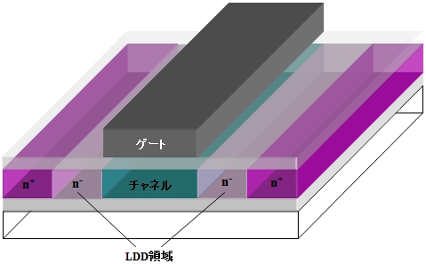 低温poly-Si TFTにおける代表的なデバイス構造。図のようにイオンドーピングに濃度勾配を設け、チャネルとn+の間に濃度の1桁低いn-の領域(LDD領域)を形成してドレイン電界を小さくする。