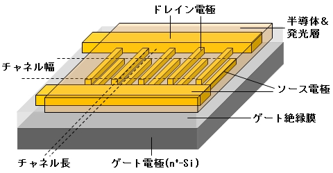 | ▲代表的な有機発光トランジスタの構造例(機能一体型有機発光トランジスタ) |