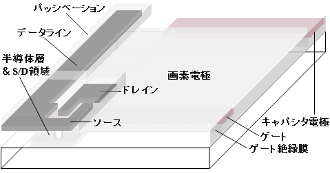 a-Si TFTが量産化された当時はエッチングストッパー型が主流だったが、コストダウンのため、今日ではすべてバックチャネル型となっている。一方、IGZO-TFTをはじめとする酸化物TFTでは酸化物半導体層がよりセンシティブのため、いまだエッチングストッパー型が主流になっているようだ。