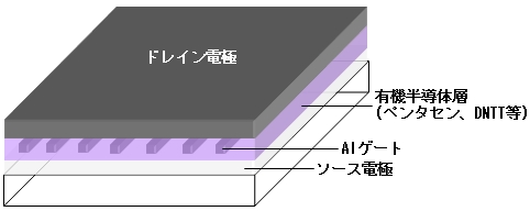 縦型SIT(静電誘導トランジスタ:Static Induction Transistor)はソースとドレインを縦方向に配置し、ソース〜ドレイン間にゲート電極を埋め込んだ有機半導体層を用いるのが特徴。ソース〜ドレイン間に流れる電流をゲート電極に印加する電圧によってコントロールするもので、有機半導体層の膜厚が電流経路になるため、チャネル長を100nm以下に微細化することが容易である。この結果、低電圧動作と高速応答が容易になる。その反面、ON/OFF電流レシオは他の有機トランジスタに比べ大幅に低い。